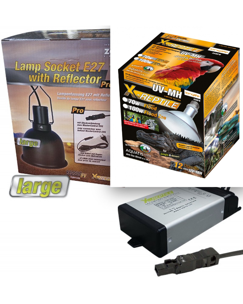 Wenn Sie schon ein solches Set im Warenkorb haben, können Sie hier ab dem 2. Set nochmals einen Sonderpreis erhalten. Die X-Reptile UV-MH sind die zur Zeit modernsten und effizientesten Lampen für Terrarien. Vergleichen Sie dazu auch einige der aktuellen REPTILIA Artikel auf dieser Seite. Die aufwendig produzierten Lampen erzeugen gleichzeitig naturnahe UV-Abstrahlung, konzentrierte Wärme und ein sehr helles Grundlicht (z.B. 70’000-100’000 Lux bei 30cm, 70W-Varianten). Es handelt sich also nicht mehr nur um “UV-Strahler” im klassischen Sinne (wie bei den Mischlichtstrahler), sondern um Lampen, die wie keine andere Beleuchtungstechnik das natürliche Licht der Sonne in seiner Gesamtheit imitieren. Die Lampen wurden bei bekannten Schweizer Zoos und bei Tierärzten getestet und haben sich bei sonnenliebenden Reptilien (z.B. Bartagamen, Leguane, Warane, Schildkröten), exotischen Vögeln und Krallenäffchen hervorragend bewährt.