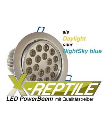 Die LED PowerBeam "Daylight" bieten effiziente Lichtkegel für die Ganztagesbeleuchtung bei Tieren und Pflanzen. Sie können als Einbaustrahler in einer Decke befestigt und geschwenkt werden oder natürich auch ohne das äussere Gehäuse eingesetzt werden. Vorallem bei vielen Dendrobatenhaltern und Orchideenzüchtern sehr beliebter und erfolgreich eingesetzter LED Strahler, in speziell für Terrarien geeigneter Tageslichtfarbe. Beinahe keine Wärmeentwicklung. erhätliche Varianten: Leistung: 12*1Watt Lichstärke:960-1080lm Grösse: 13,5x7 cm Bohrung: 11,5 cm Lebensdauer: über 30'000h Leistung: 18*1Watt (Spot mit 60° oder Flood mit 120° Abstrahlwinkel) Lichstärke:1440 - 1620lm Grösse: 16x11 cm Bohrung: 14,5 cm Lebensdauer: über 30'000h Beachten Sie, dass für diese LED's hochwertige Treiber verwendet werden, dies garantiert im Vergleich zu den Baumarktvarianten (auch wenn diese identisch aussehen!) eine bedeutend bessere Lebensdauer!!