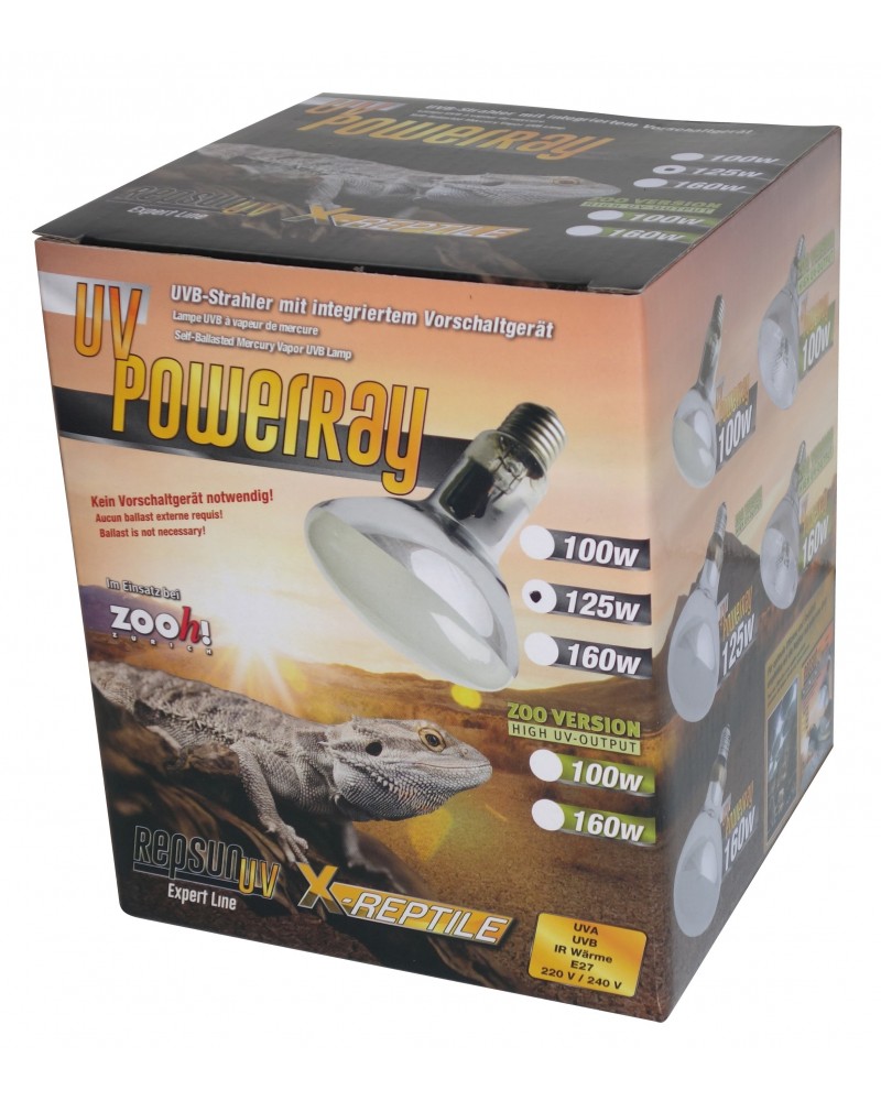 Die PowerRay wurde für 2018 neu entwickelt und besitzt ein integriertes Vorschaltgerät. Sie wurde deshalb neu entwickelt um eine noch feinere Licht- und UV-verteilung zu erhalten - ohne dennoch den bei vielen anderen Strahlern leider üblichen starken Abfall der UV-Leistung zu haben. Damit hat man bewusst punktuell geringere, aber fein verteilte UV-Werte und ein gleichmässigeres Lichtbild als bei der Zooversion. Die erzeugten Strahlungswerte in jenem UV-B Bereich, welcher stoffewechselbedingte Knochenerkrankungen durch Vit D3 Produktion verhindern, sind sehr effizient und die UV-B Leistung ist vielen üblichen UV-Mischlichtlampen überlegen.
